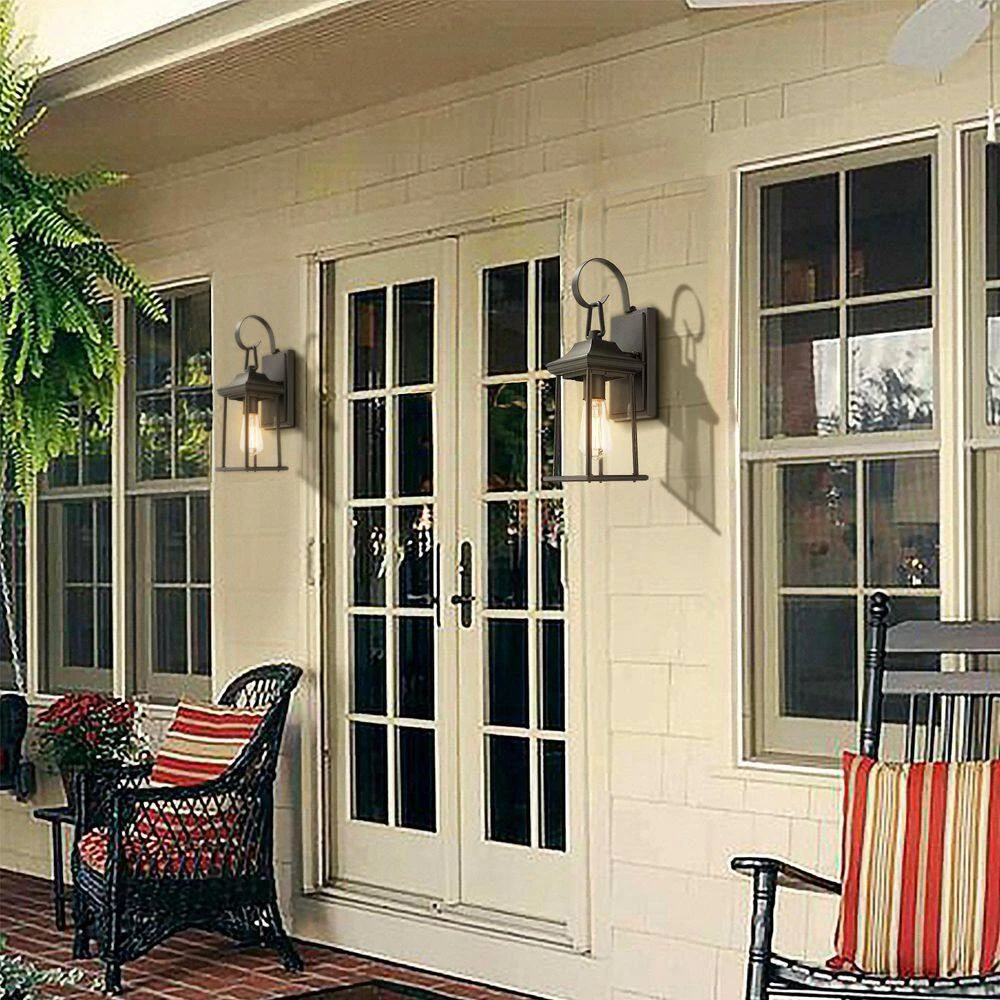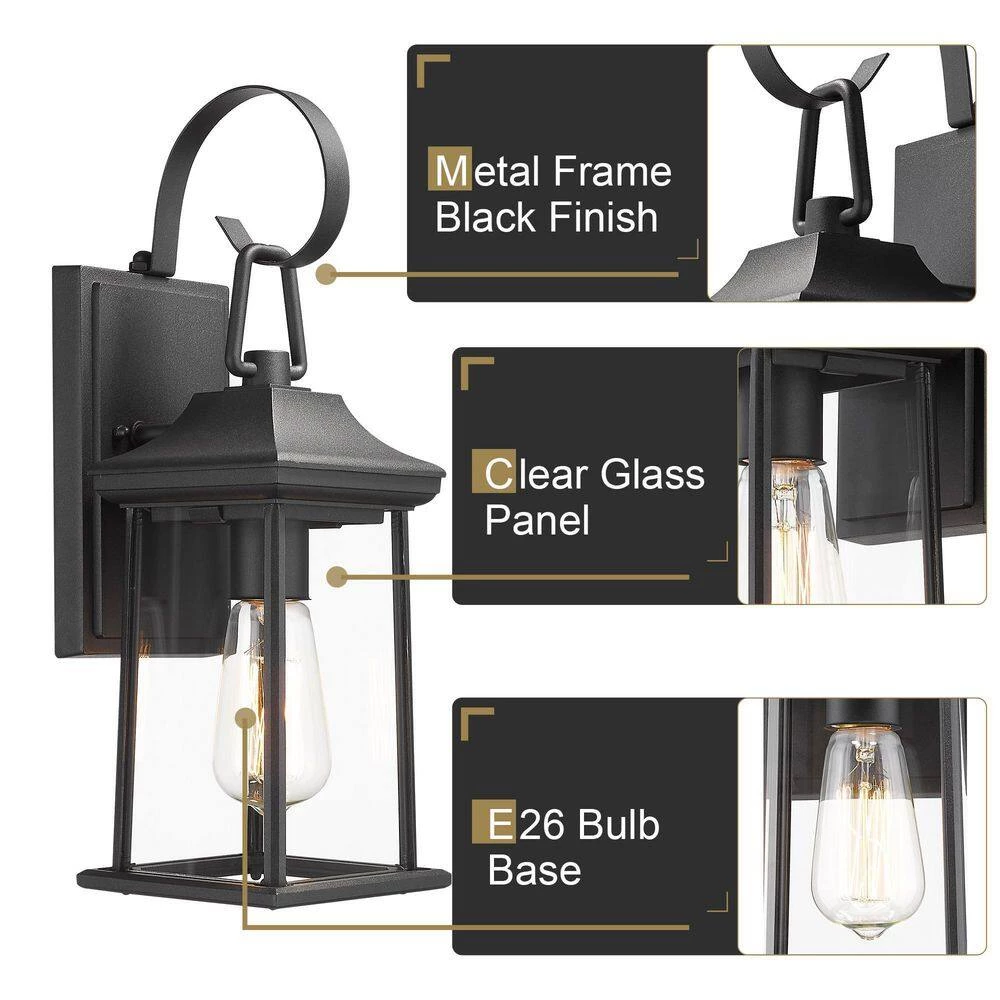 - Features sturdy matte black die-cast aluminum frame and clear glass, this outdoor wall light adds a warm vintage feel to the porch, patio, balcony, garage door, front door, hallway and entryway