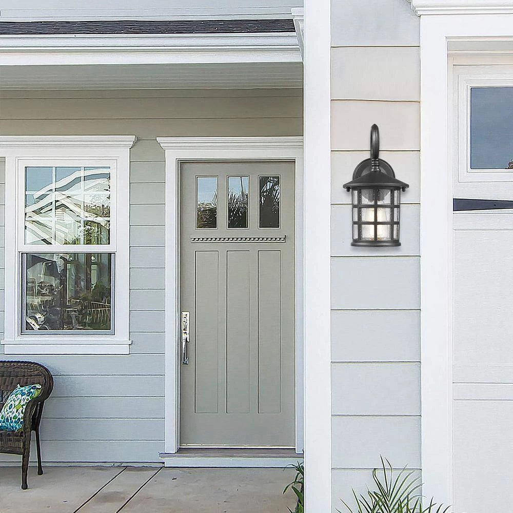 - Weather-resistant and suitable for wet locations, this farmhouse outdoor wall lighting fixture features sturdy metal and aluminum construction, with clear seeded glass in a black finish