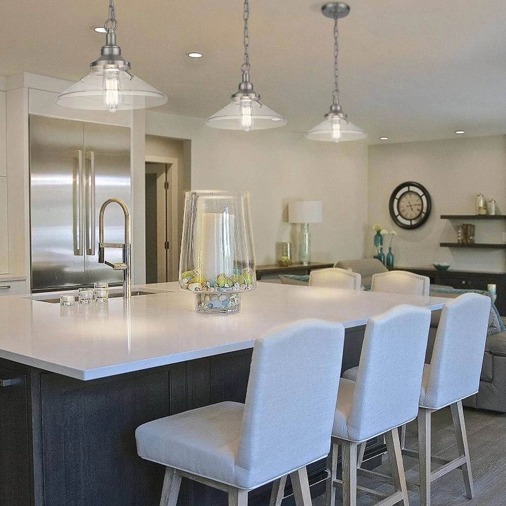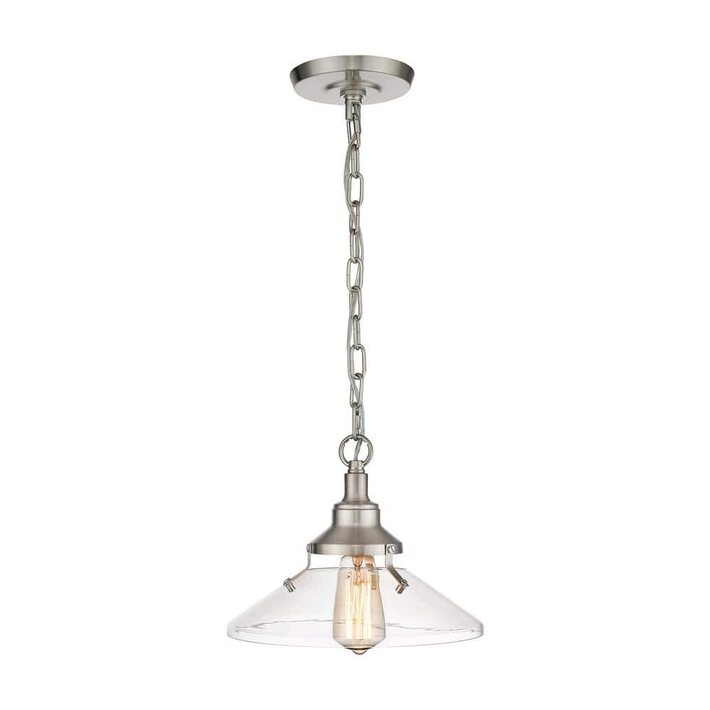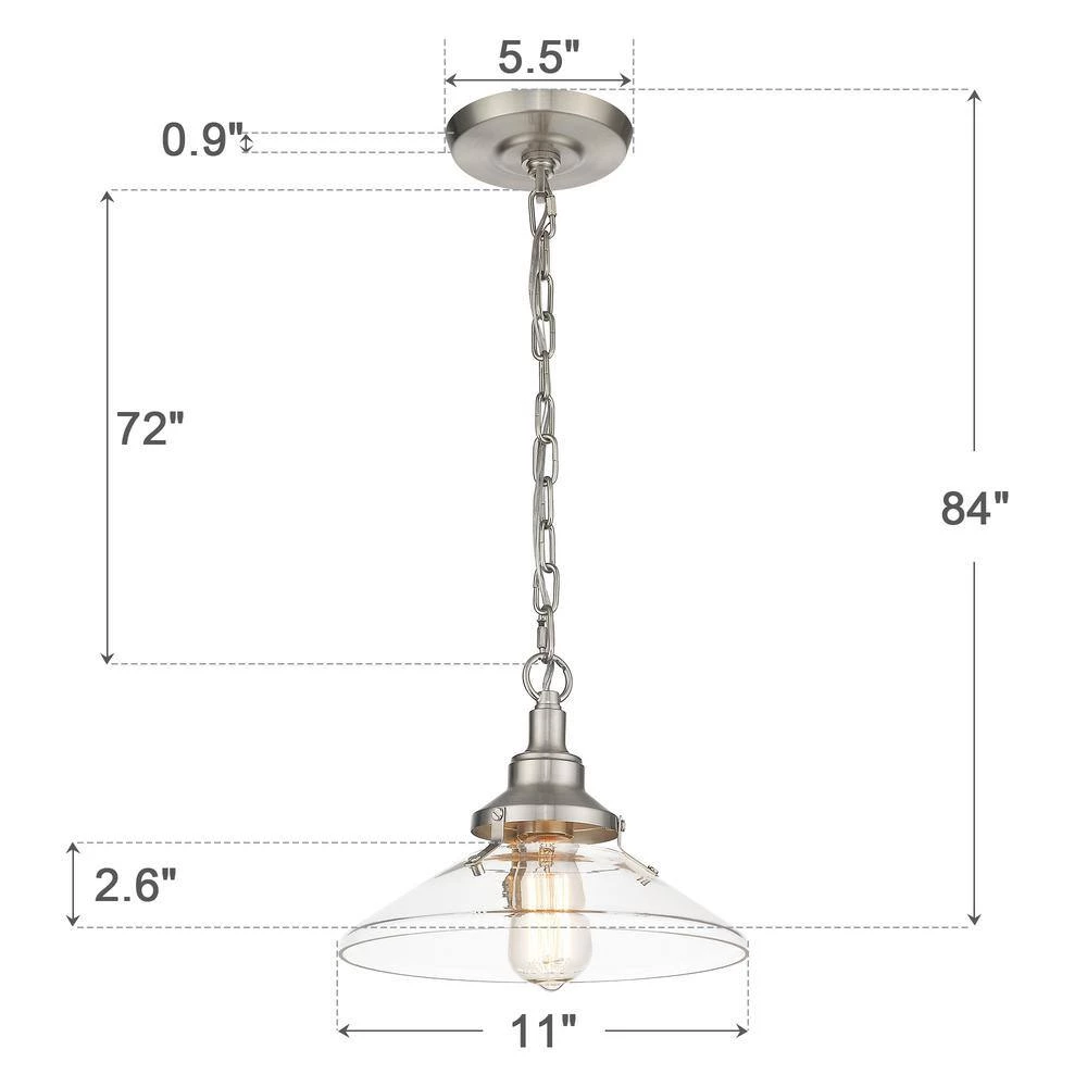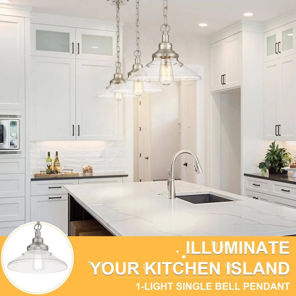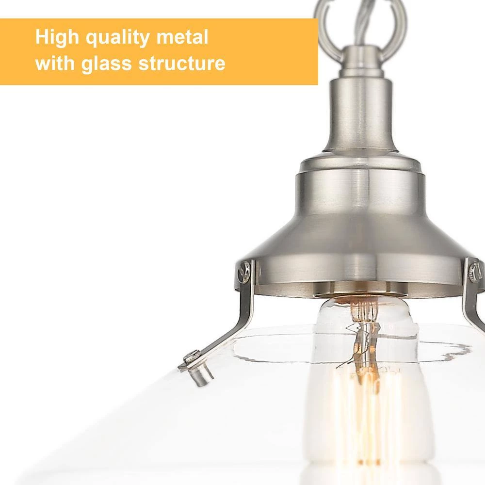 Featuring a sleek brushed nickel finish, this mini pendant light is a unique stylish fixture with a classic clear glass shade to showcase your bulb of choice. Allow this stunning light to radiate to brighten up your space. Hanging from great heights or simply hovering above your kitchen island for useful illuminationCrafted from metal, this fixture features a bell canopy, a elegant body and an adjustable chain,can be adjusted to the length you want.