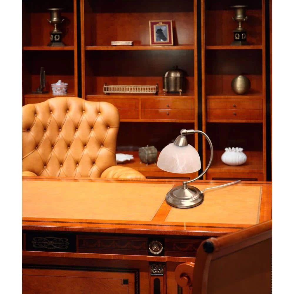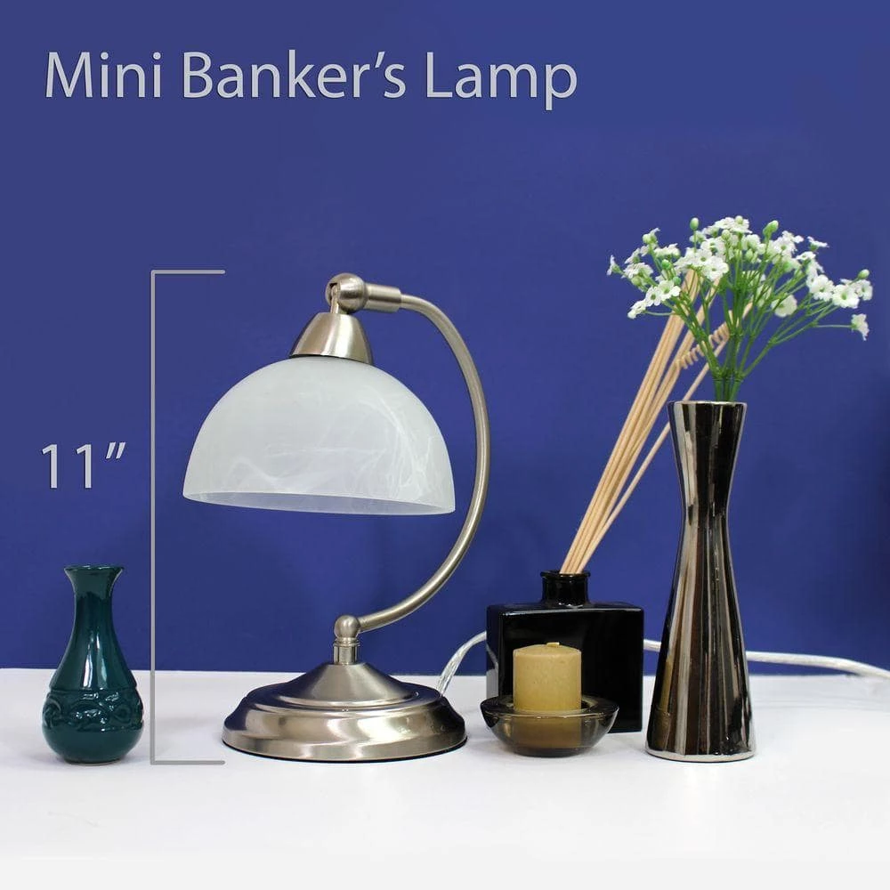 This 11 in. mini modern banker’s desk lamp features a curved arm and touch control dimmer base with an exquisite brushed nickel finish. The marble glass shade finishes the look. A charming, inexpensive, and practical desk lamp to meet your fashion lighting needs. Perfect lamp to complement your office decor.