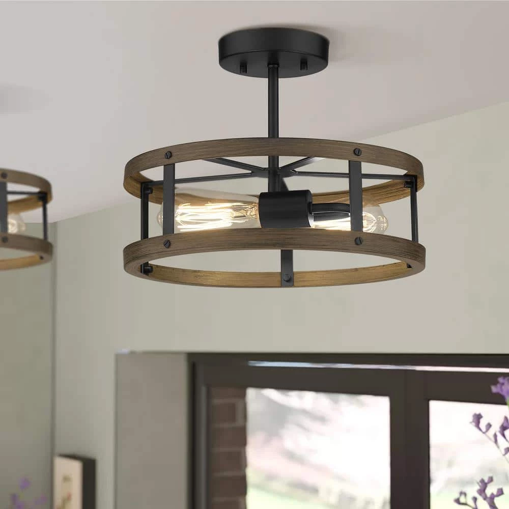 This trendy, antique black and wooden, drum-style fixture provides a vintage-inspired option to light kitchens, gathering areas, hallways, and foyers as well as restaurants and hospitality applications. Like designs seen in high-end home furnishing stores, this 2-light semi-flush mount compliments the look of almost any space and pairs nicely with vintage filament lights. Cylinder geometric opened design provides for an elegant and classic appearance. This light fixtures ceiling flush mount requires 2 x E26 base bulbs (Max 60-Watt). Bulb NOT included.