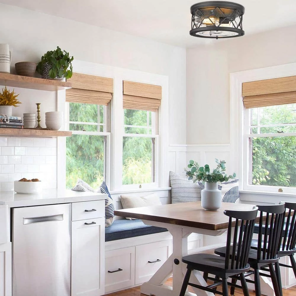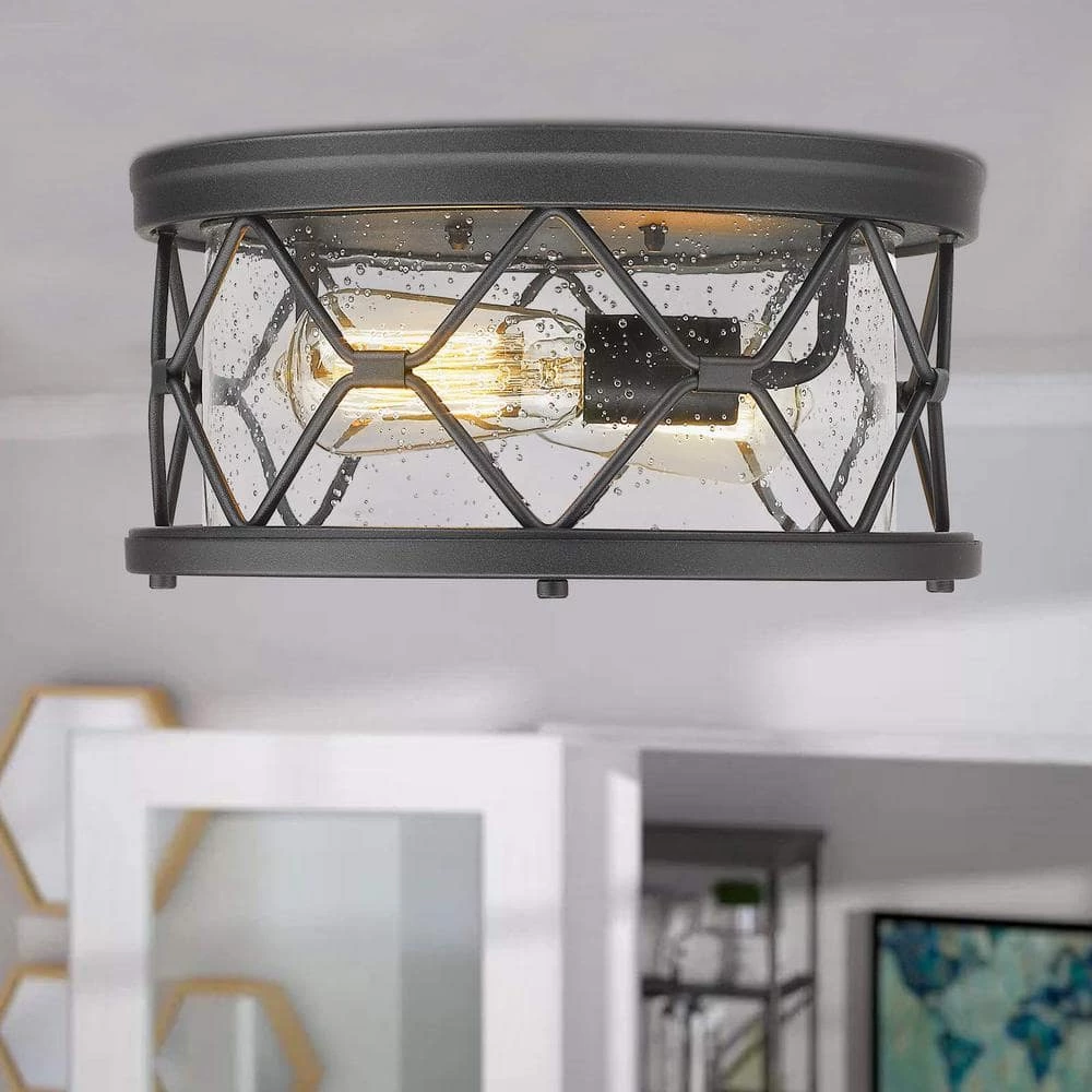 Featuring a modern industrial design, this close to ceiling light fixture is made of a metal cage frame with seeded glass shade in a black finish.Creating a chic and farmhouse look in your house. Take action now and light up your life.