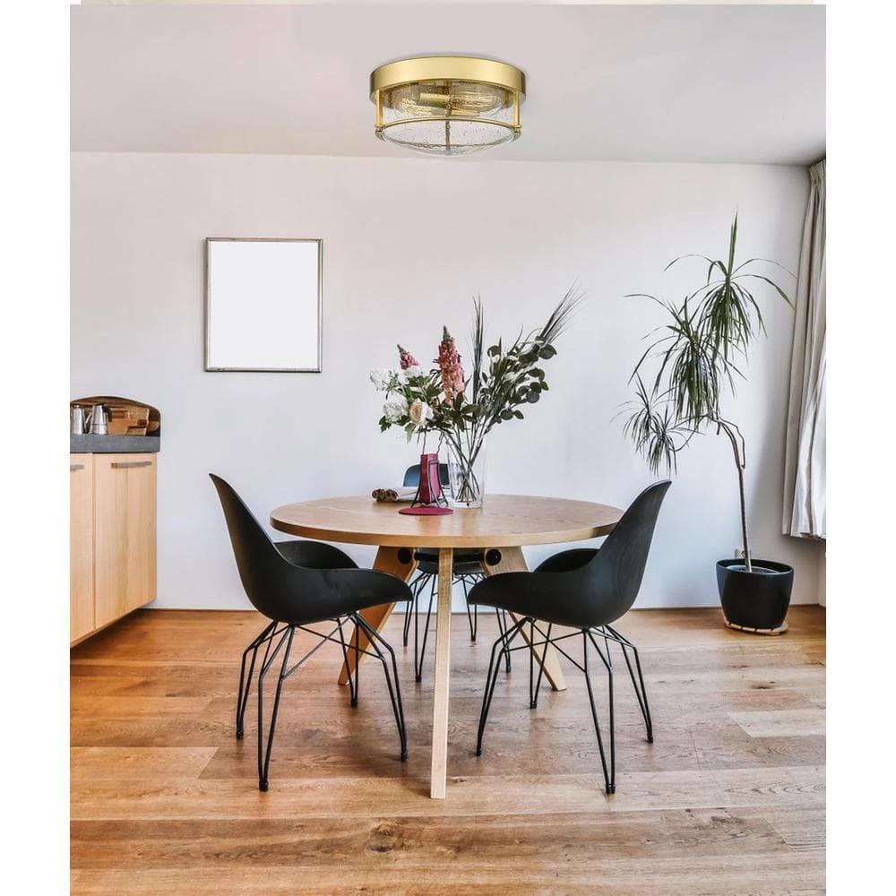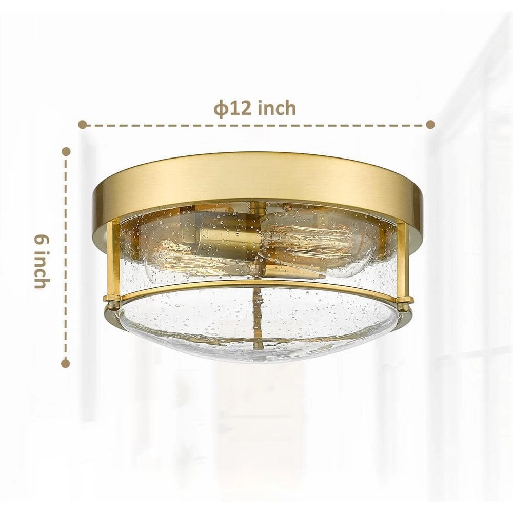 This 12 in. 2-light flush mount light with gold finish heavy-duty metal construction and clear seeded glass shade, suitable for any environment, this truly versatile piece is weather resistant and can be placed outside or inside for a trend-setting look. It is perfect for the kitchen, bedroom, garage, foyer, hallway, stairway, basement, laundry or any other place. It is time to breathe new life into the mundane every day with a refreshed lighting design. Make your purchase today to begin your journey to a whole new lighting experience.