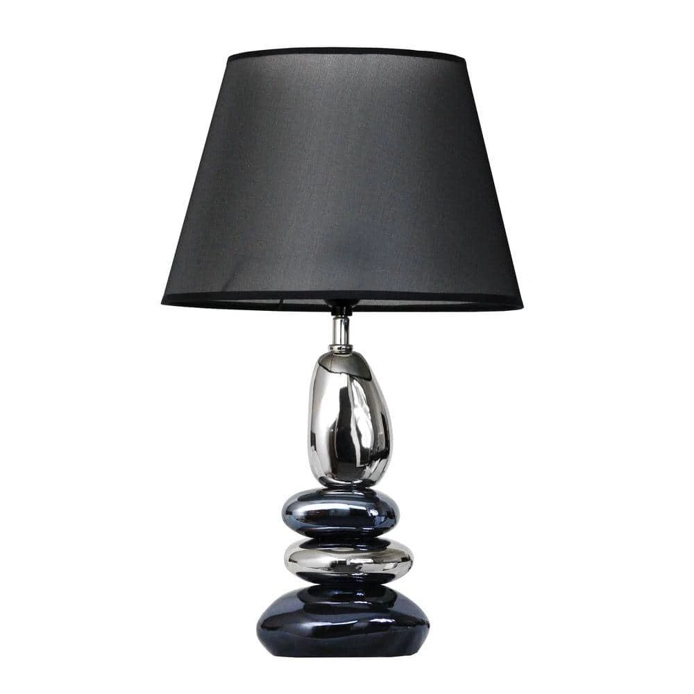 Add a contemporary flair to any room with this lovely stacked stone table lamp. Chrome and metallic blue plated ceramic stones come stacked four high to create this extremely modern lamp. The black fabric shade completes the look. Perfect lamp for a bedroom, living area, or office. We believe that lighting is like jewelry for your home. Our products will help to enhance your room with chic sophistication.