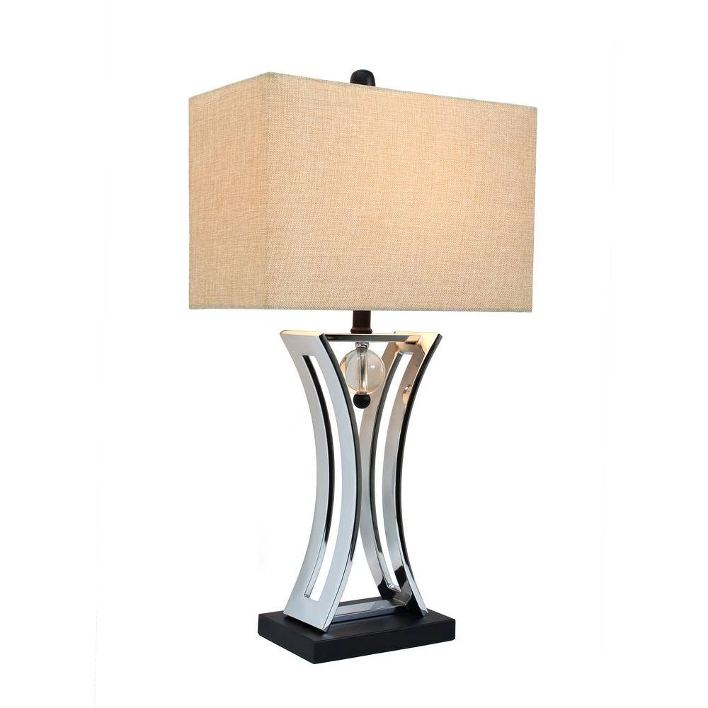 Add a contemporary flair to any home, conference room, office or waiting area with this modern table lamp. Featuring an hourglass shape and pendulum design, the unique design suits a wide variety of decors. The chrome finish body, matte black base, and commercial beige and brown rectangular shade complement the eye-catching look.