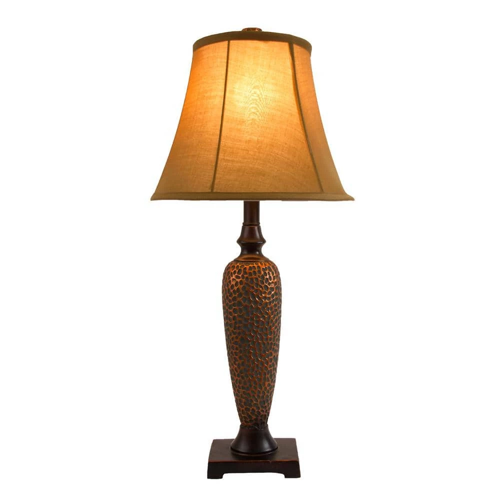 - Beautiful beige fabric shades and exquisite hammered bronze finish