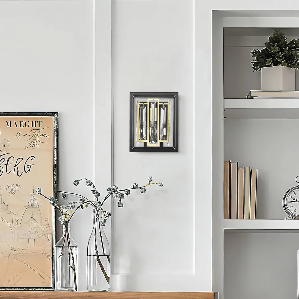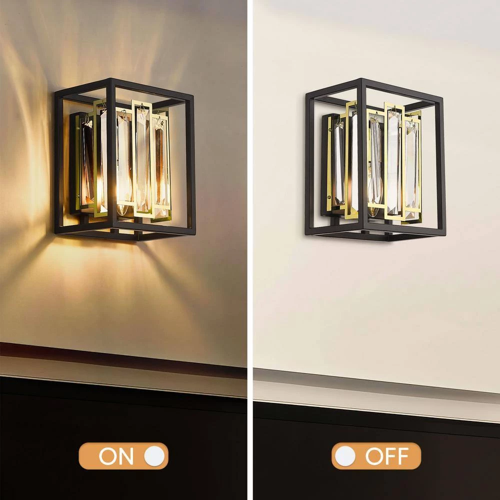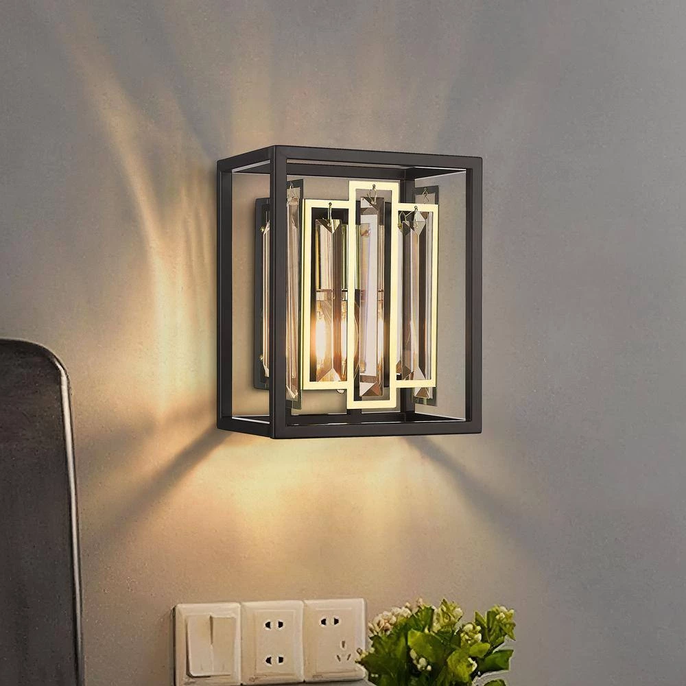 This indoor wall light features a textured black finish, decorated with clear crystals and a gold frame that is durable and looks beautiful. The indoor wall sconce with geometric shade diffuses a cozy glow for an inviting feel and offers a modern & vintage style while complementing your home decor. Would you like to replace that old wall light fixtures with the latest trends. This wall sconce lighting is exactly what you need.