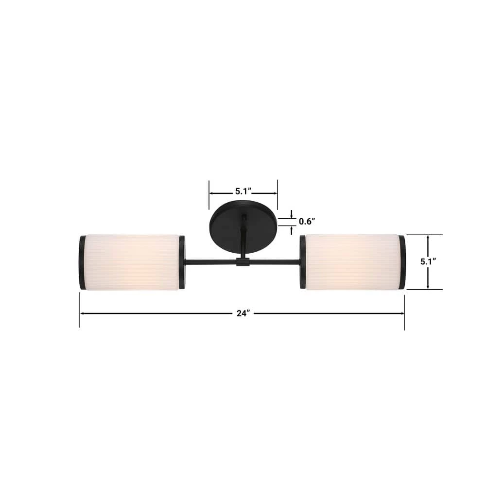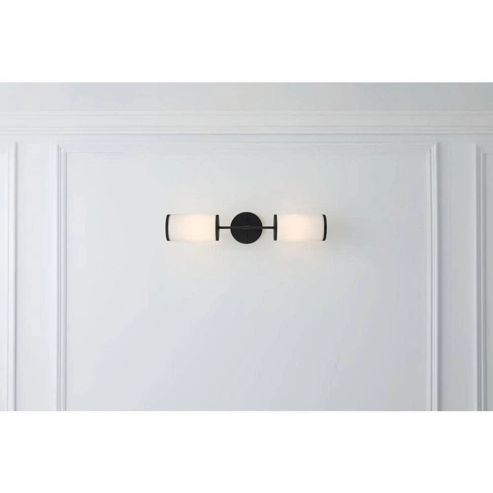 The Ashbury 2 Light Vanity is available in a rich black finish. The reeded milk glass compliments the overall look making it a perfect fit for any modern shower setting. This vanity light is an exquisite example of a contemporary fixture with a hint of traditional.