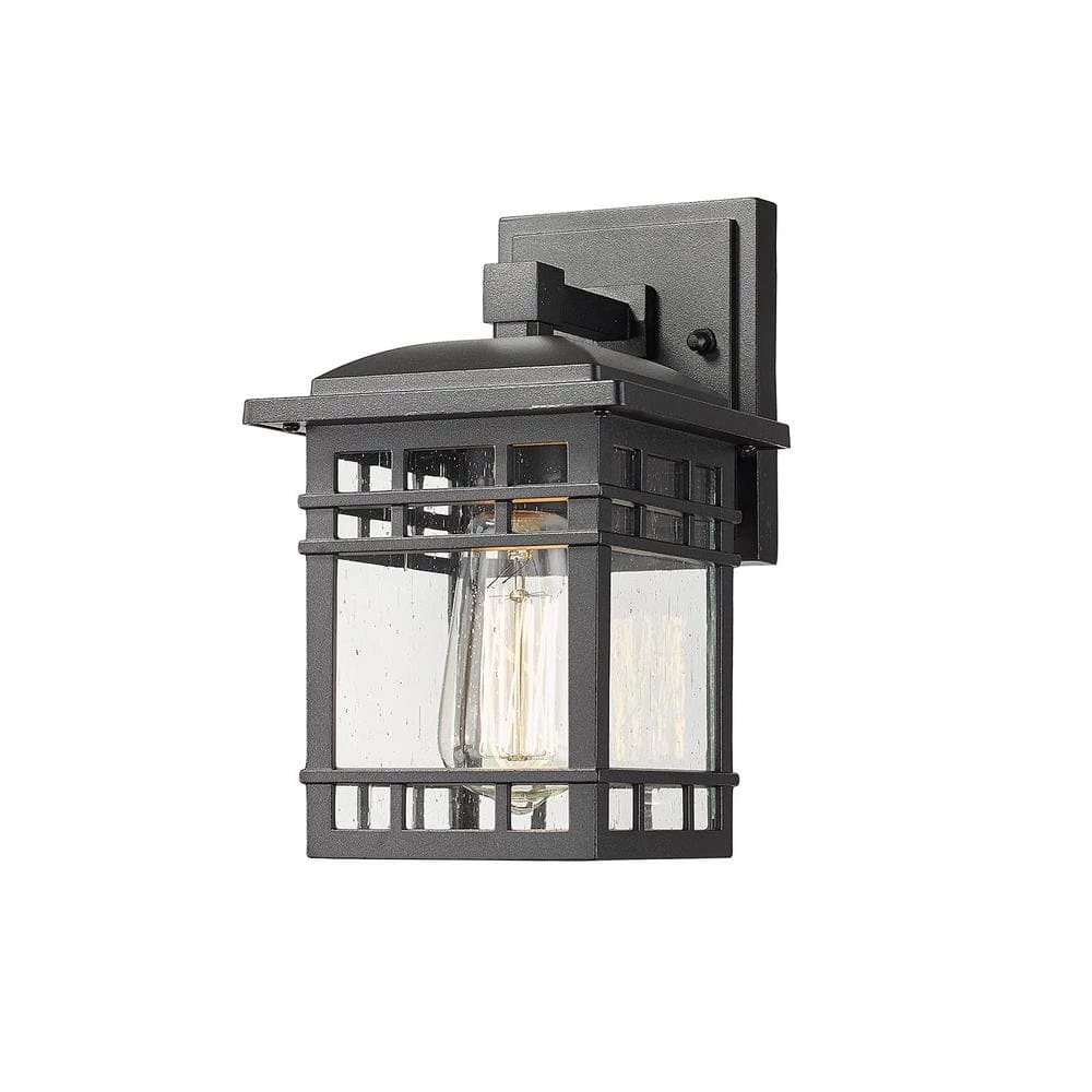 - Outdoor wall light fixture features sturdy aluminum construction and seeded glass shade in a black finish