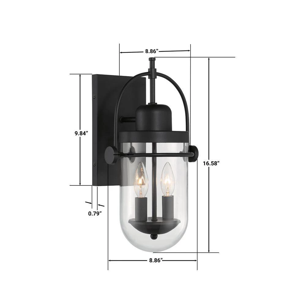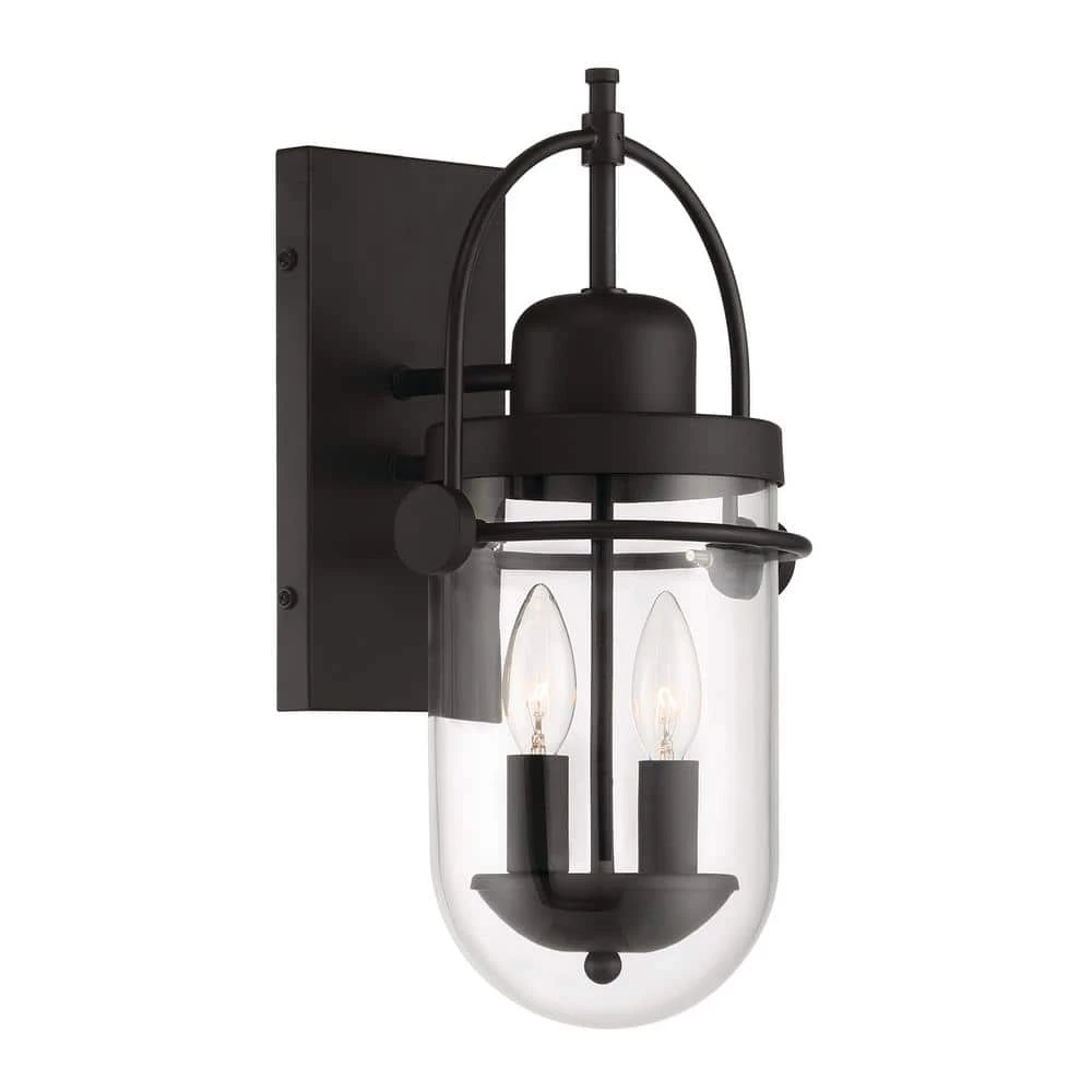 A modern take on the hurricane, the Lowell outdoor lighting collection from GlucksteinElements features a matte black finish paired with clear glass. Available in pendant, sconce, and post mount styles. This contemporary-meets-classic design houses a cluster of candelabra lights that emanate a warm glow.