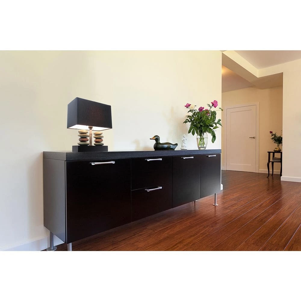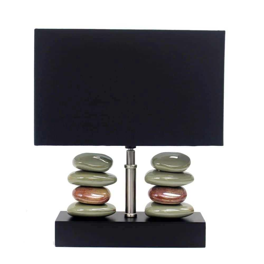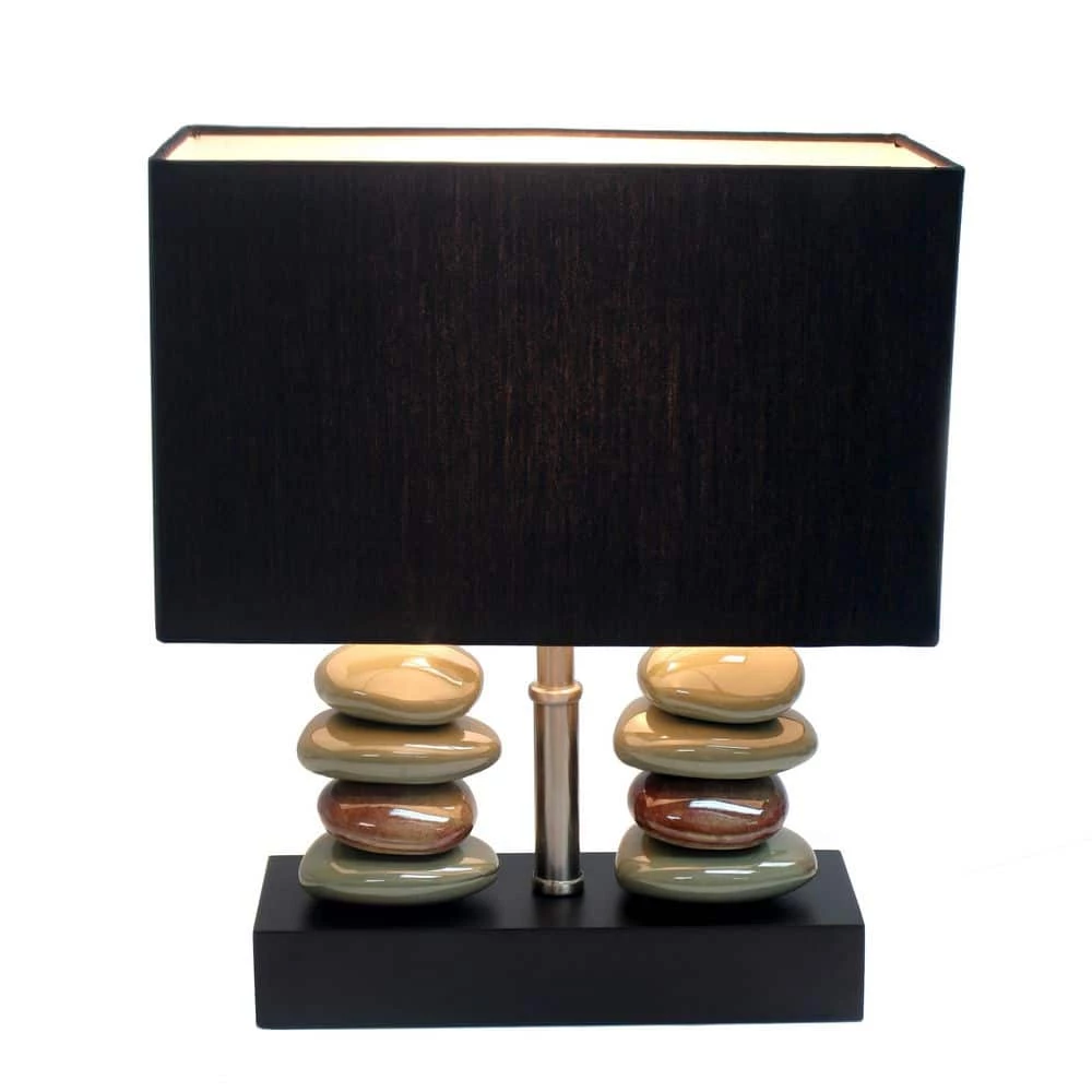 Add contemporary lighting to your home with this stacked stone table lamp. Dual rows of ceramic stones sit atop a rectangular base to create this chic modern lamp. A black fabric shade diffuses the light and completes the look. Perfect for a bedroom, living area, or professional office.