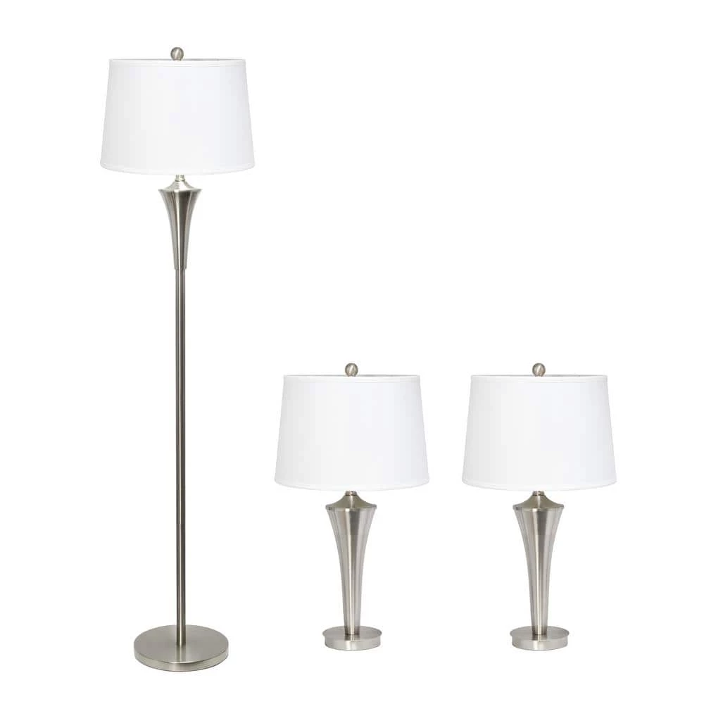 Redecorating or moving into a new space can be wonderful when you find those pieces that transform a basic room into a page right out of your interior design magazine! Get inspired to upgrade your home and/or office by purchasing this sleek and modern table and floor lamp 3 pack set. Perfectly adaptable to both professional and personal spaces, the attractiveness of the brushed nickel finish combined with the sleek, tapered design balances perfectly against the white fabric shade to enhance your space into a room you love. What a great way to beautify your space with a small investment into a timeless lamp set!